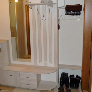 Компания «Хельга мебель» может предложить еще один мини-вариант - обувную тумбу оригинальной конструкции с панелью для крючков, дополненную большим зеркалом в металлической раме. Иногда такую панель заменяет небольшой шкаф в прихожую. Он может быть декорирован изысканным витражом, иметь удобные выдвижные ящики, торцевые вешала и галстучницы. Благодаря такой функциональной «начинке», небольшой по габаритам шкаф в прихожую оказывается исключительно вместительным.